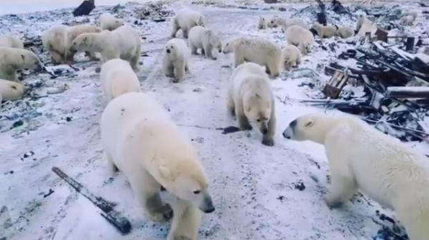 Các đoạn video cho thấy những con gấu Bắc cực ăn rác tại một bãi rác địa phương. Một số nỗ lực dọa chúng bằng còi xe và chó đều thất bại, hãng tin Tass cho biết.