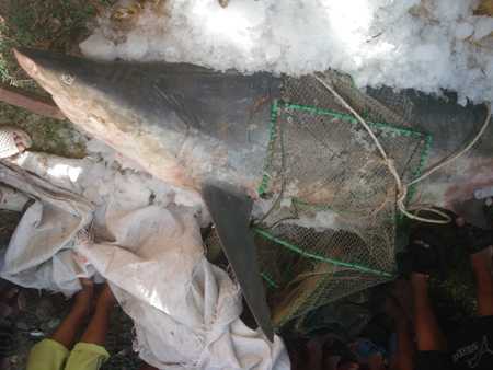 Chủ nhân của con cá cho biết, rạng sáng nay, khi đang thăm rập nhử cua, ghẹ tại bãi tắm Hoàng Hậu (thuộc phường Ghềnh Ráng, TP.Quy Nhơn), cách bờ khoảng 200m, thì phát hiện con cá mập này mắc rập.