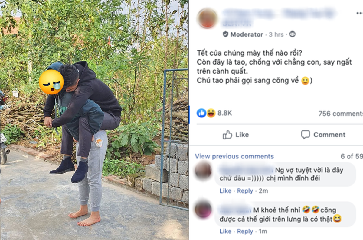 Theo đó, người chồng này sau khi đi chúc Tết người thân thì đã ở lại uống rượu. Tuy nhiên, sau đó, anh chàng đã say bí tỉ đến mềm nhũn người mà không thể tự đi về nhà. Cuối cùng, cô vợ đành phải sang cõng chồng về.