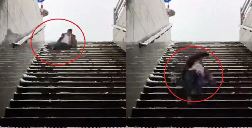 Người đàn ông Trung Quốc ngồi châm lửa hút thuốc trên bậc thang phủ tuyết trơn, không may trượt ngã "dập mông".