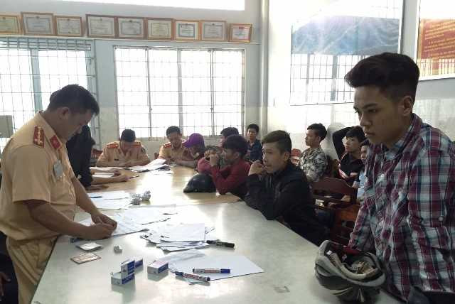 Các thanh niên tụ tập cổ vũ, tham gia đua xe trái phép được đưa về trụ sở Công an xử lý. Ảnh Minh Anh.