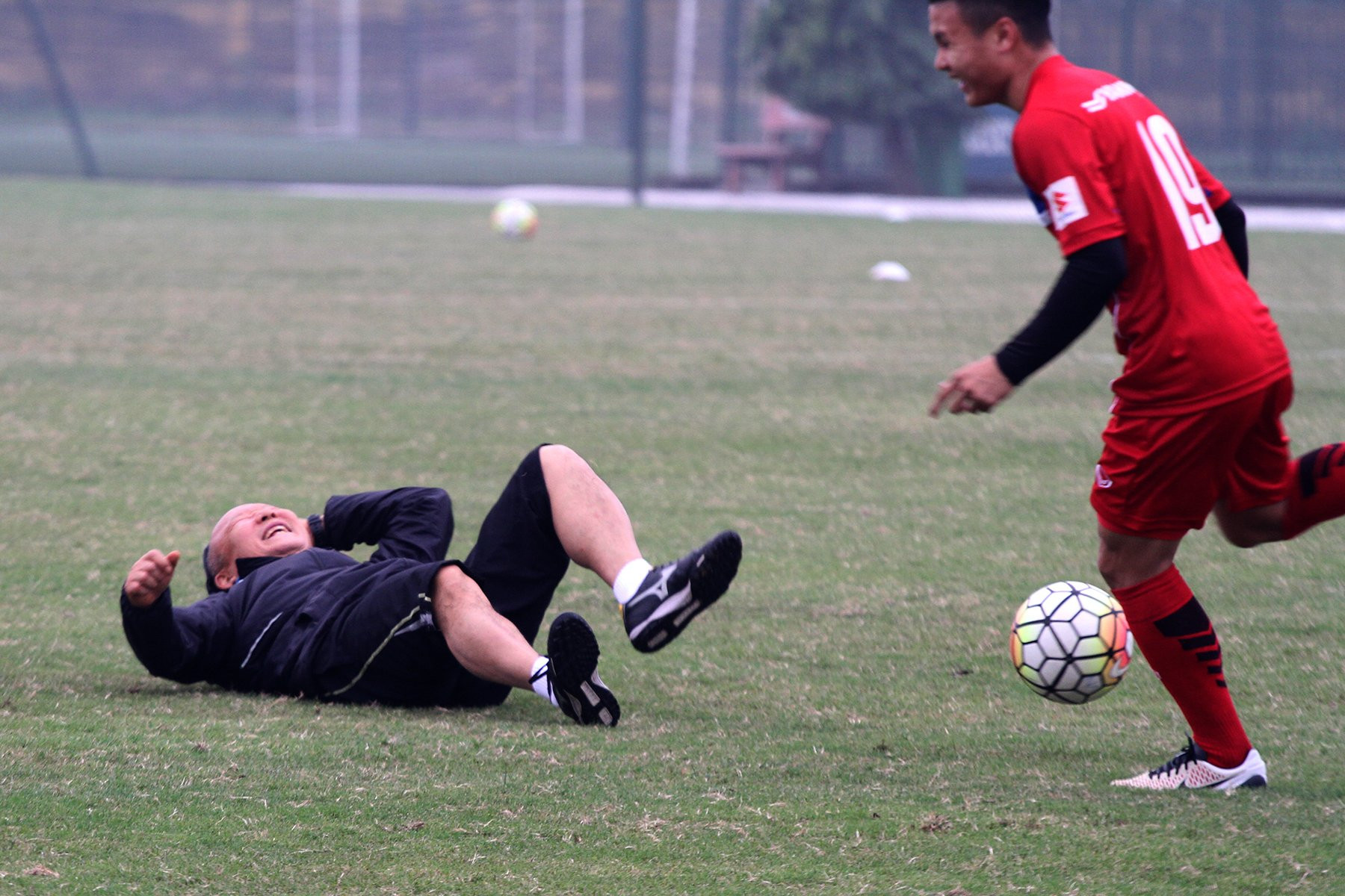 Thầy Park khiến cả sân bật cười khi bị một cầu thủ xỏ háng, sau đó ông nằm lăn ra sân như "ăn vạ".