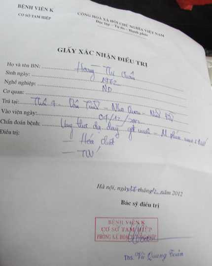 Khi chúng tôi quay lại, chị vẫn khư khư cầm chiếc túi ni lông màu đỏ với bệnh án bên trong. Chị chìa giấy xuất viện cho chúng tôi xem. Tên chị là Hoàng Thị Châm, sinh năm 1972 (thôn 4, Vân Trình, Nho Quan, Ninh Bình).