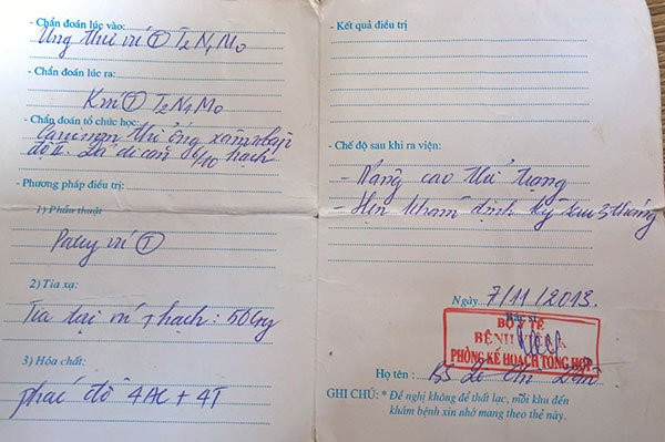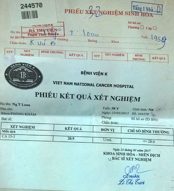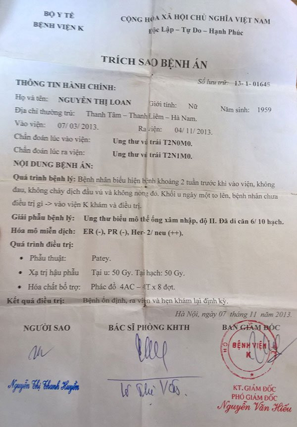 Bà Loan đem ra bệnh án của mình, “Bệnh viện K, Bộ Y tế” kết luận rõ: Ung thư vú trái, Ung thư biểu mô thể ống xâm nhập, độ 2, đã di căn 6/10 hạch. Bên dưới có dấu triện đỏ chót và chữ ký của Phó Giám đốc Bệnh viện K Trung ương, ông Nguyễn Văn Hiếu (ký ngày 7/11/2013).