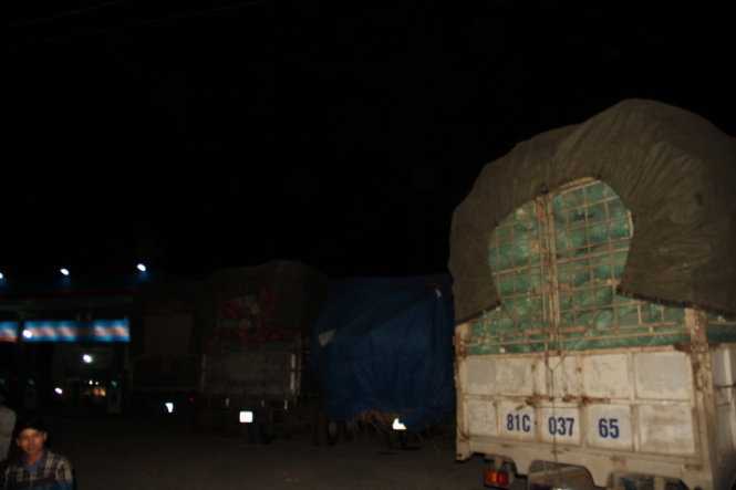 | Hàng trăm xe quá tải tập trung ở các cây xăng, đường dân sinh tại thị xã An Khê để chờ cơ hội vượt trạm - Ảnh chụp tối 16/4. Ảnh: B.D |