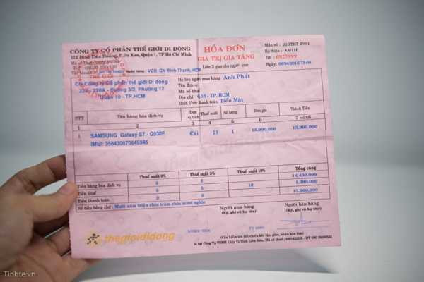 Chiếc hóa đơn VAT của Thế Giới Di Động bán kèm máy nhìn không thể phân biệt thật-giả. Tuy nhiên, kiểm tra thì thấy IMEI ghi trên hóa đơn và IMEI máy khác nhau, như vậy chắc chắn hóa đơn này là của máy khác. Căn cứ chi tiết này và độ “thật” của hóa đơn, có người phán đoán đây là hóa đơn thật của một máy Samsung S7 chính hãng, còn máy nhái dĩ nhiên không liên quan đến hóa đơn này.