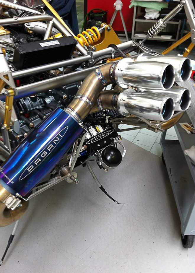 Khác với những ống xả truyền thống thường gắn bộ phận giảm thanh, ống xả trên Huayra được làm phình lớn tạo những buồng tăng âm bởi động cơ tăng áp thường có tiếng pô khá nhỏ.