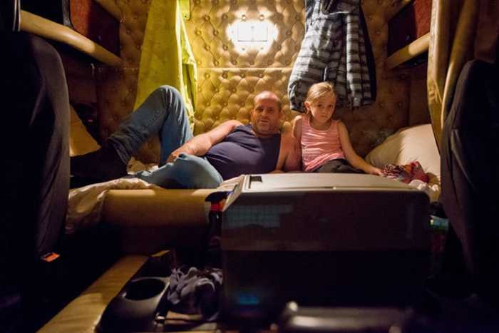 Dave và con gái Paige mất nhà trong một vụ hỏa hoạn gần thị trấn Yarram, bang Victoria hồi đầu năm nay. Trong ảnh, hai bố con Dave ngồi trong cabin có đủ những vật dụng cần thiết cho cuộc sống rong ruổi trên đường.