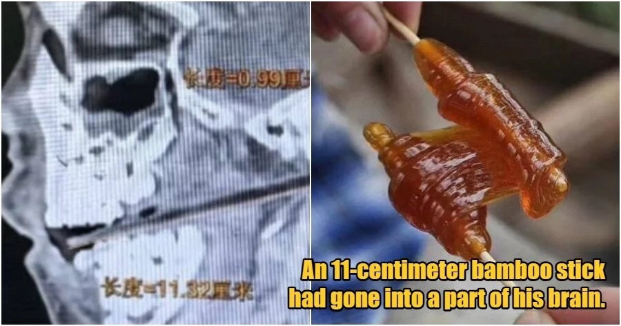 Sự việc xảy ra ngày 26/3 trên đường phố ở Quảng Đông, Trung Quốc. Cậu bé Xiao Zhu (6 tuổi) chạy nhảy vui đùa trong lúc miệng vẫn ngậm loại kẹo gắn vào que tre dài. Khi cậu bé ngã, thanh kẹo đã đâm xuyên qua miệng vào tận gốc hộp sọ, cuối cùng đâm xuyên qua não.