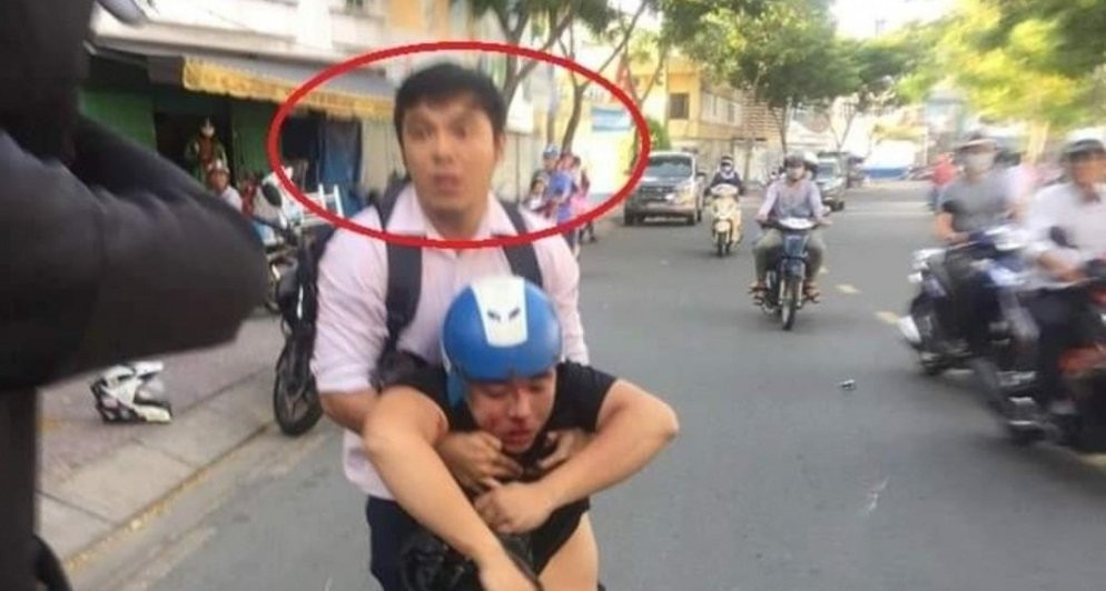 Ngay khi vừa thấy người đàn ông áo đen, anh ta liền dùng mũ bảo hiểm đánh vào đầu người này. Bị đánh mạnh vào đầu, nạn nhân bật ngửa ra sau và ngã xuống đất, bất tỉnh.