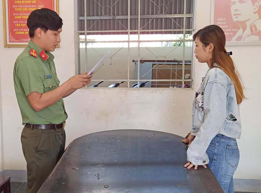 Công an huyện Dầu Tiếng trao quyết định xử phạt hành chính cho Hồng.