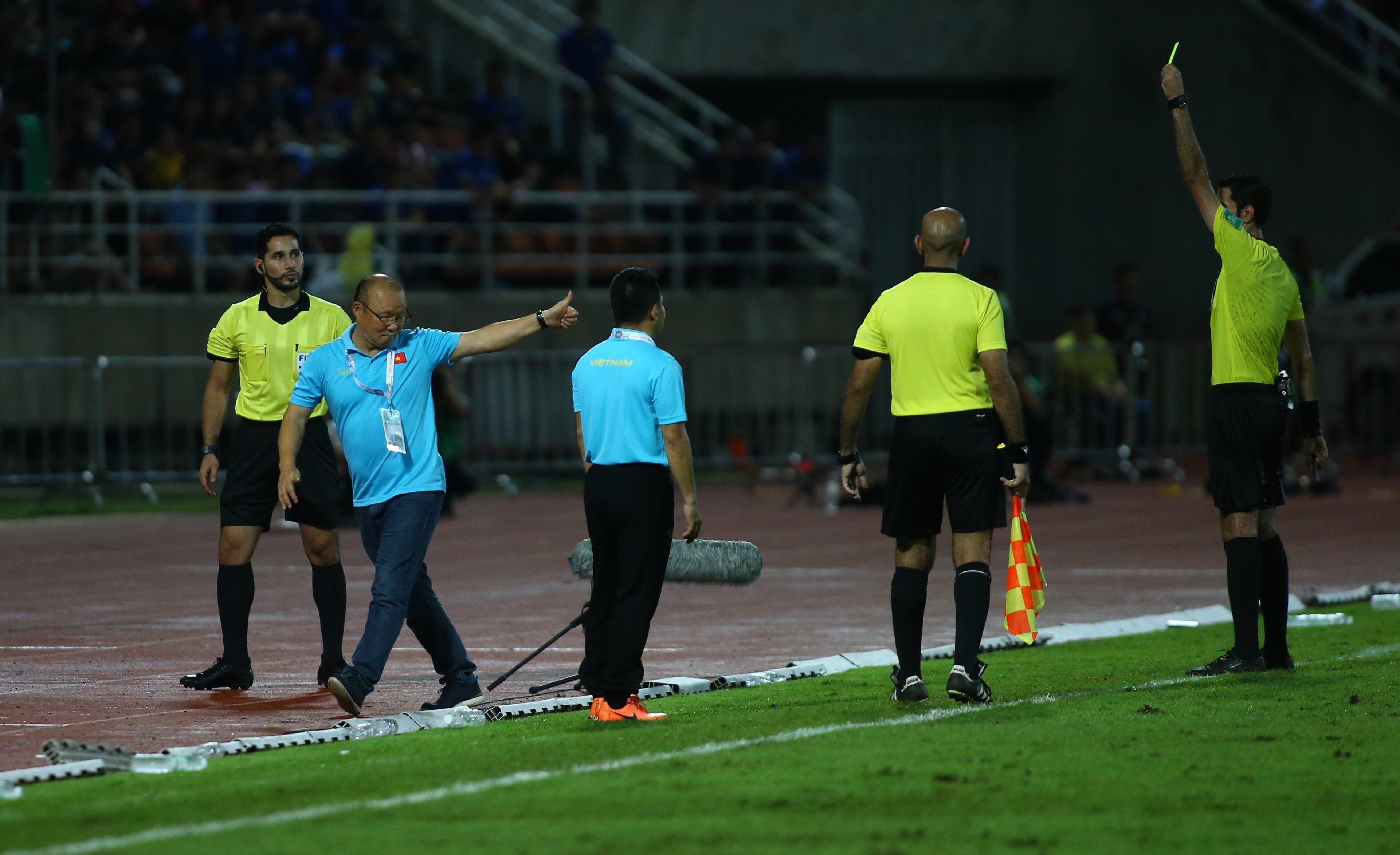 Trong một khoảnh khắc phản ứng nóng nảy, HLV Park Hang Seo bị trọng tài chính cảnh cáo bằng chiếc thẻ vàng. Nhà cầm quân người Hàn Quốc nói xin lỗi và thừa nhận rằng hành động của ông trong trận đấu có phần không đúng mực.