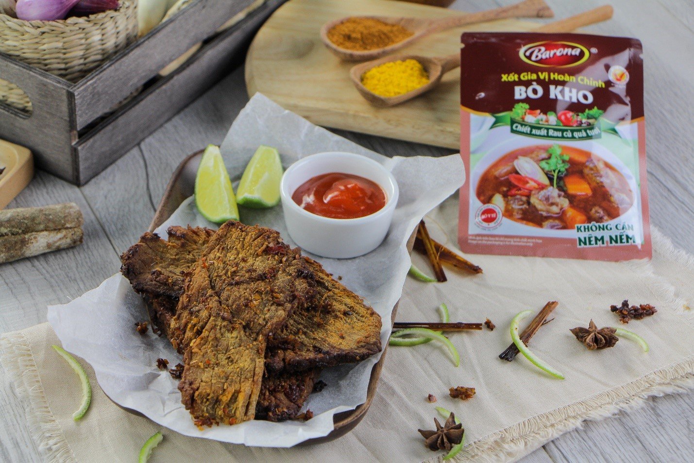 Món Giả Khô Bò thơm ngon khó cưỡng, thịt heo giả khô bò với hương vị đậm đà hòa quyện mùi thơm từ các loại gia vị, từng thớ thịt dai ngon khiến bạn ăn hoài không ngán. Không những ngon mà còn lại là một giải pháp rất kinh tế khi sử dụng thịt heo, vừa an toàn mà chất lượng thì không hề thua kém thịt bò. Thực hiện lại rất đơn giản với sự trợ giúp từ Gia vị hoàn chỉnh Barona – Bò Kho bạn nhé!
