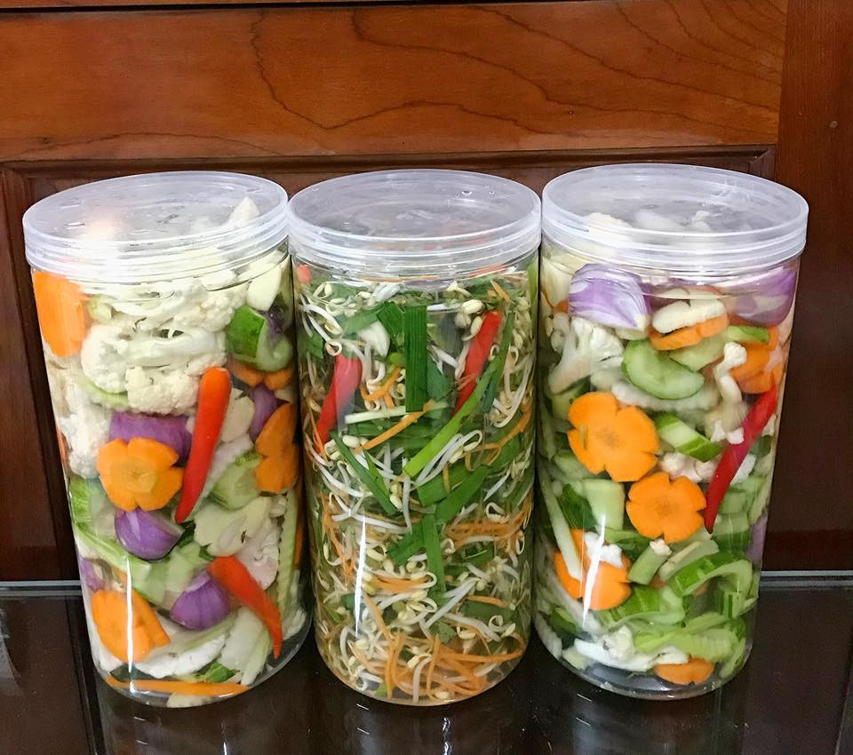 - Xếp rau củ quả vào lọ, xem kẽ ớt, tỏi, gừng, hành khô lần lượt đến hết rồi đổ nước ngập rau củ quả, đậy lắp kín sau 2-3 ngày là ăn được. Dưa muối khi bắt đầu ăn được thì bảo quản trong ngăn mát tủ lạnh được khoảng 1 tuần.