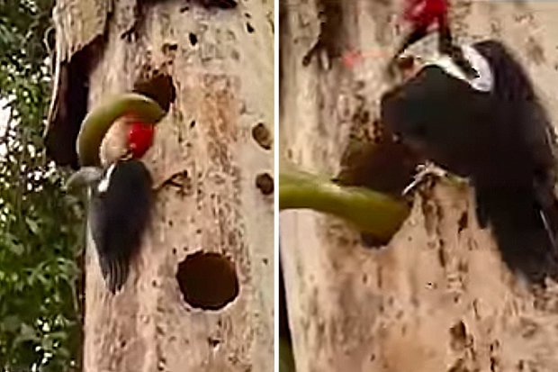 Đoạn video được quay ở Amazon mở đầu bằng cảnh con chim gõ kiến dùng mỏ tấn công liên tục vào con rắn dài hơn 3 m.