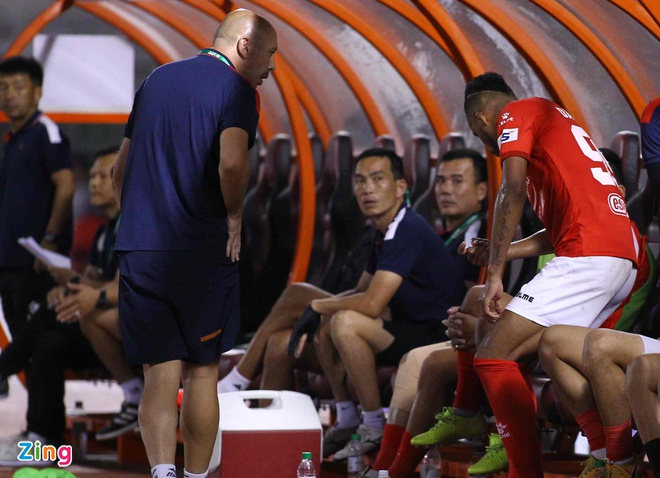 Số 99 của CLB TP.HCM sút bay chai nước suối. Anh cầm một chai khác rồi ném xuống đất khi ngồi xuống ghế. Cầu thủ sinh năm 1991 liên tục càm ràm vì bị thay ra.