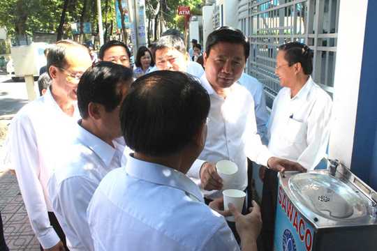 Bí thư Thăng cùng lãnh đạo TP uống nước tại vòi trước trụ sở Sawaco