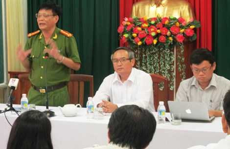| Đại tá Nguyễn An Ninh, Phó Giám đốc Công an tỉnh Bình Định (đứng) trả lời các câu hỏi của PV tại cuộc họp báo. Ảnh: TẤN LỘC |
