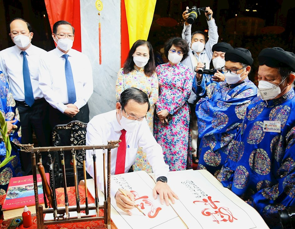 Bí thư Thành ủy TP.HCM Nguyễn Văn Nên thực hiện nghi thức khai bút đầu năm. (Ảnh: Long Hồ/Thành ủy TP.HCM)