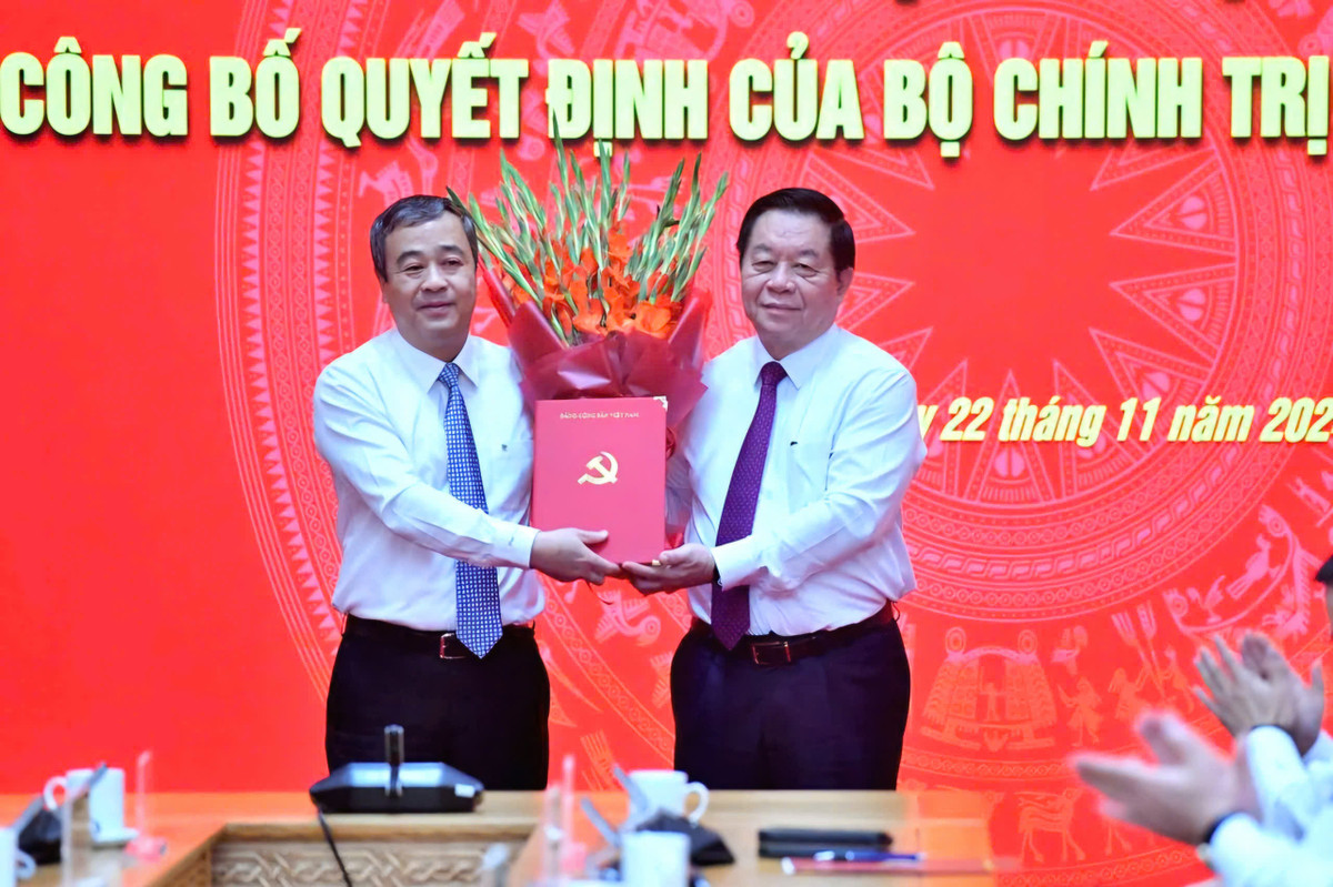 Trưởng Ban Tuyên giáo Trung ương Nguyễn Trọng Nghĩa thay mặt Bộ Chính trị trao quyết định và tặng hoa chúc mừng ông Ngô Đông Hải.