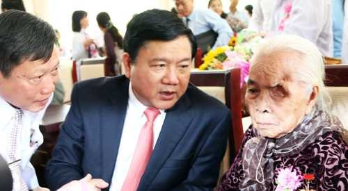 | Ông Đinh La Thăng thăm hỏi mẹ Việt Nam anh hùng Võ Thị Mượt. Ảnh: Trung Sơn |