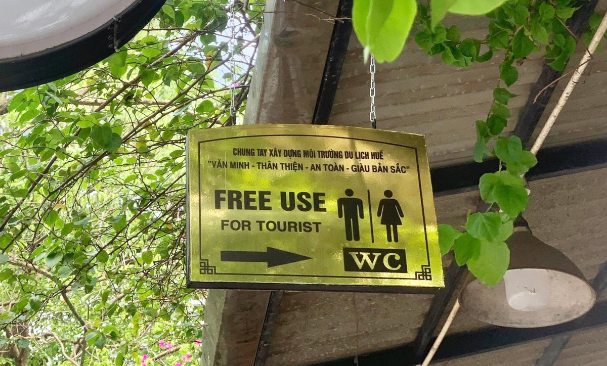Ngành chức năng gắn biển "WC free use for tourist" tại một cơ sở kinh doanh ở TP Huế.