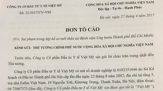 Đơn tố cáo của ông Hà Văn Nam (Giám đốc Công ty Cổ phần Đầu tư Y tế Việt Mỹ) về hàng loạt sai phạm trong lập hồ sơ mời thầu tại Bệnh viện Ung bướu TP.HCM.