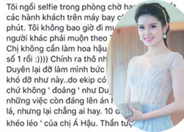 Người này còn nhắn nhủ với Á hậu: "Chị không cần là Hoa hậu cũng đã đứng số 1 rồi" và cho rằng, "chính thô nhưng thật như Kỳ Duyên" lại đỡ làm họ bức xúc. Họ còn lấp lửng rằng, Huyền My có những việc "đáng lên án hơn của hút thuốc lá".
