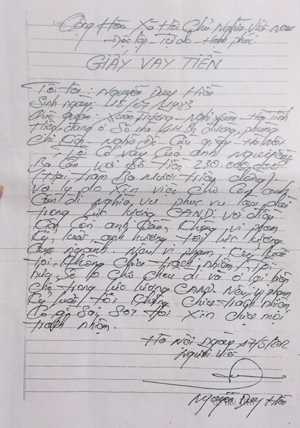 | Giấy vay tiền của anh Hiền với ông Cần. |