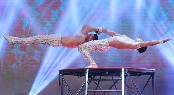 Tối 26/9, đêm nghệ thuật "Gala Ngôi sao Sân khấu Việt Nam" do Hội Nghệ sĩ Sân khấu Việt Nam tổ chức nhân kỷ niệm 60 năm Sân khấu Việt Nam đã diễn tại Hà Nội. Đêm diễn hội tụ của gần 100 nghệ sĩ các loại hình nghệ thuật sân khấu, như: tuồng, chèo, cải lương, kịch nói, hài kịch, xiếc…Trong ảnh, hai "hoàng tử xiếc" Quốc Cơ - Quốc Nghiệp khiến khán giả thót tim với phần trình diễn mạo hiểm và đẹp mắt.
