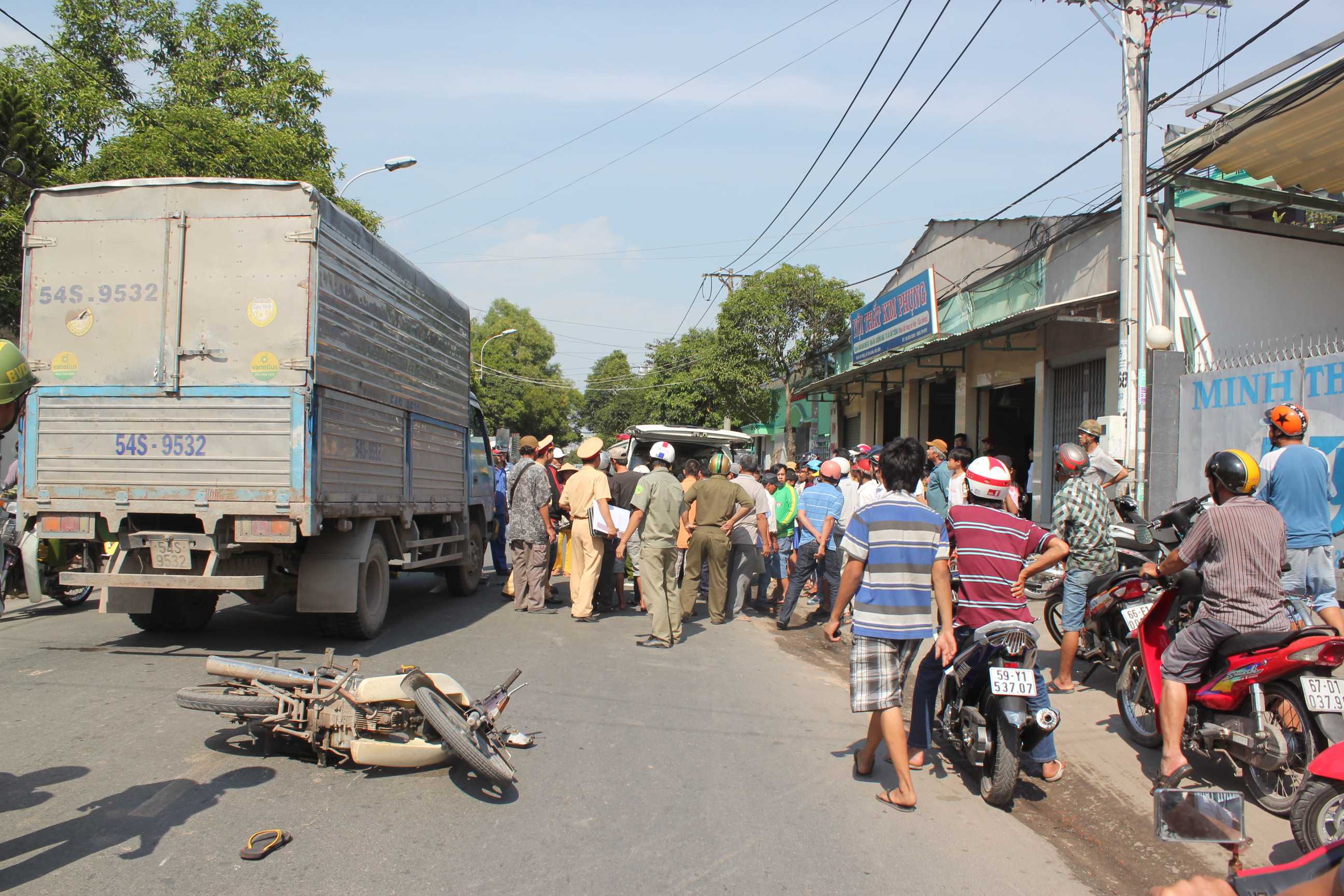Nhiều người vây kín hiện trường để xem vụ việc Đến 14h,30 (cùng ngày) hiện trường vụ tai nạn được xử lý xong, thi thể nạn nhân được chuyển về nhà xác bệnh viện Đa khoa huyện Hóc Môn để phục vụ công tác khám nghiệm tử thi.