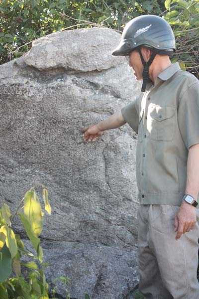 | Anh Trung trò chuyện với PV về những ký tự trên bia đá cổ. |