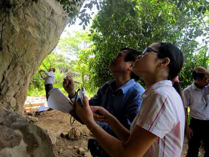 | Các nhà nghiên cứu đang ghi chép, giải thích các bích họa trên mái đá Cửa Chùa. |