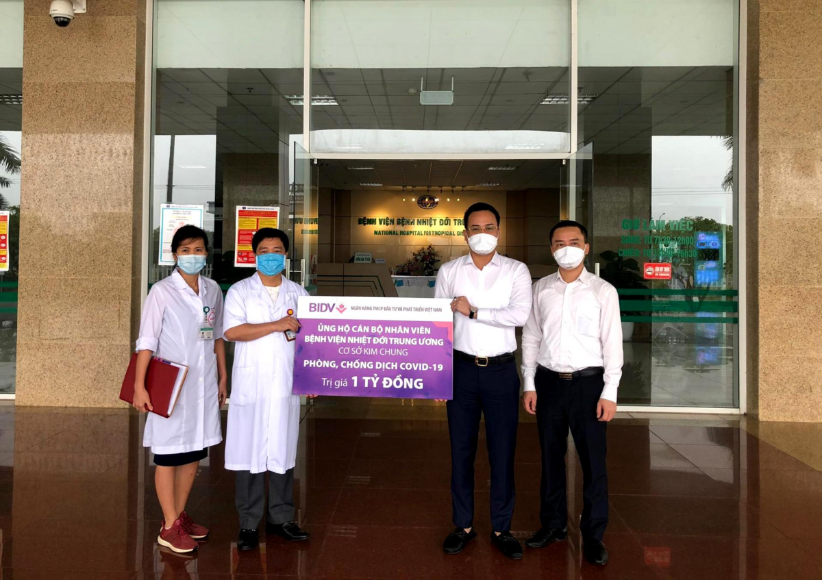 Ông Phạm Trọng Hưng - Phó Giám đốc Chi nhánh BIDV Đông Hà Nội, đại diện BIDV thực hiện trao tặng chi phí hỗ trợ tại Bệnh viện Nhiệt đới Trung ương - Cơ sở Đông Anh Hà Nội cho biết: “Trong thời điểm hiện nay, đội ngũ cán bộ y tế tuyến đầu chống dịch là lực lượng rất cần được quan tâm, bảo vệ và hỗ trợ từ cộng đồng. Thông qua chương trình, BIDV mong muốn đồng hành cùng khách hàng lan tỏa tinh thần nhân ái, trách nhiệm vì cộng đồng, cùng đất nước chiến thắng dịch bệnh”.