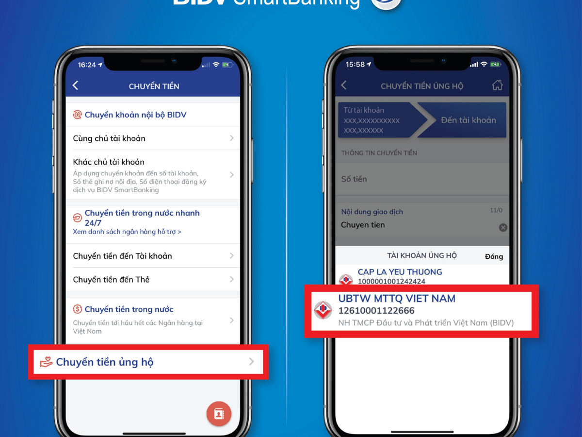 Chi tiết tại trang thông tin tin điện tử của UBTW MTTQ tại đây; website của BIDV tại đây hoặc liên hệ tổng đài chăm sóc khách hàng 24/7 theo số hotline 1900 9247 để được hỗ trợ.