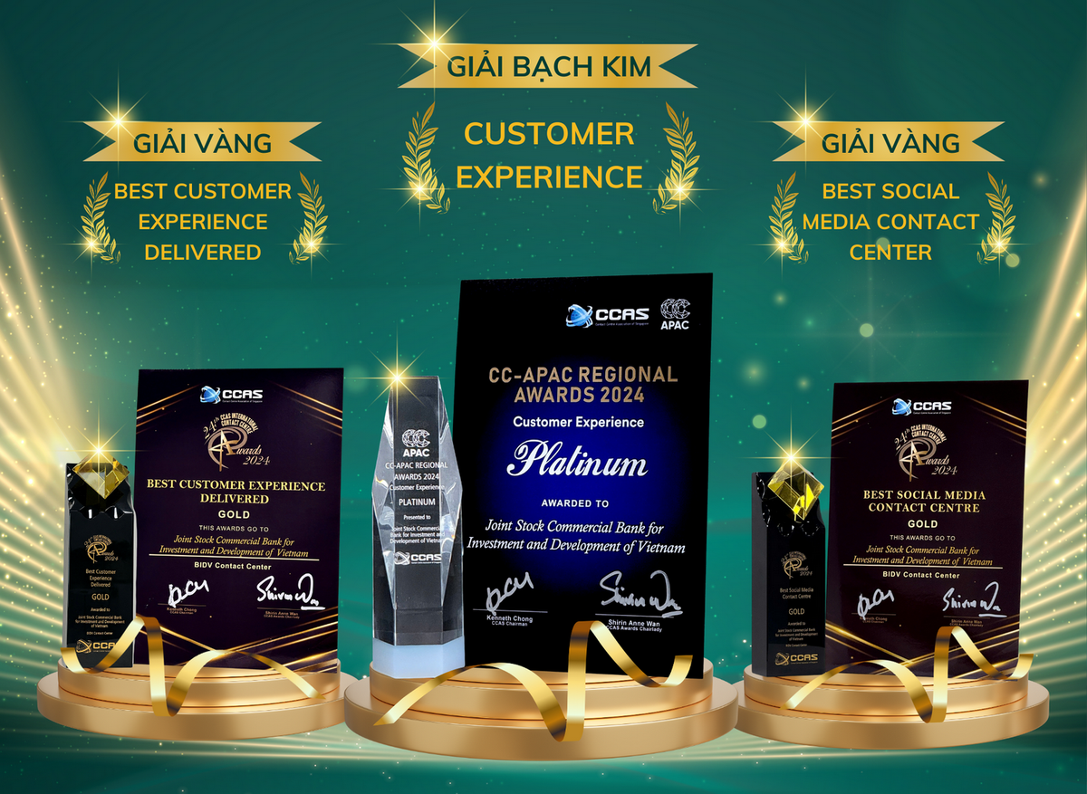BIDV nhận 3 giải thưởng quốc tế: Giải Bạch Kim hạng mục "Trải nghiệm khách hàng xuất sắc" do Hiệp hội Contact Centre Châu Á - Thái Bình Dương (CC-APAC) trao tặng và 2 Giải Vàng hạng mục "Trải nghiệm khách hàng tốt nhất" và "Contact Centre cung cấp dịch vụ mạng xã hội tốt nhất" do Hiệp hội Contact Centre Singapore (CCAS) trao tặng.