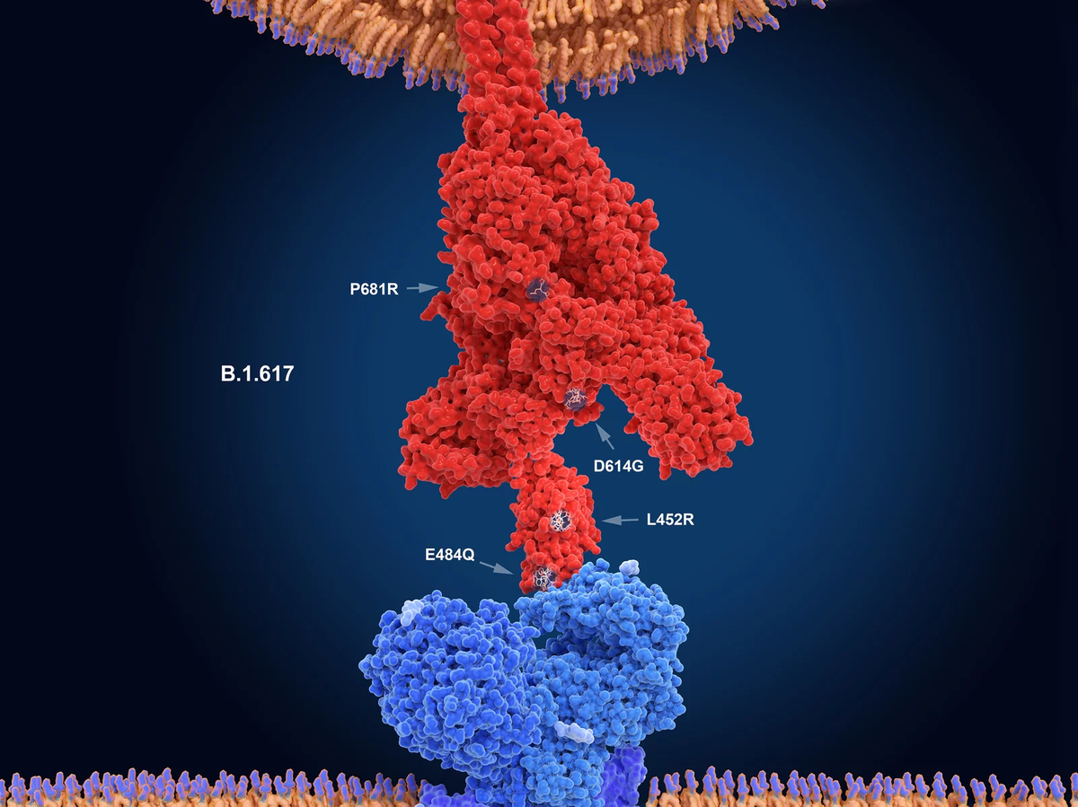Hình minh họa cho thấy biến thể Delta (màu đỏ) liên kết với một thụ thể trên tế bào cơ thể người (màu xanh). Các chữ số trong hình minh họa này cho thấy các vị trí đột biến chính của biến thể Delta. (Ảnh: Science Source)