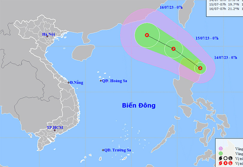 Dự báo lúc 7h ngày 15/7, áp thấp nhiệt đới di chuyển theo hướng Tây Bắc, mỗi giờ đi được 15-20 km, trên khu vực phía Bắc Biển Đông, cách đảo Luzon khoảng 160km về phía Tây Bắc. Sức gió mạnh nhất vùng gần tâm áp thấp mạnh cấp 6-7, giật cấp 8-9.