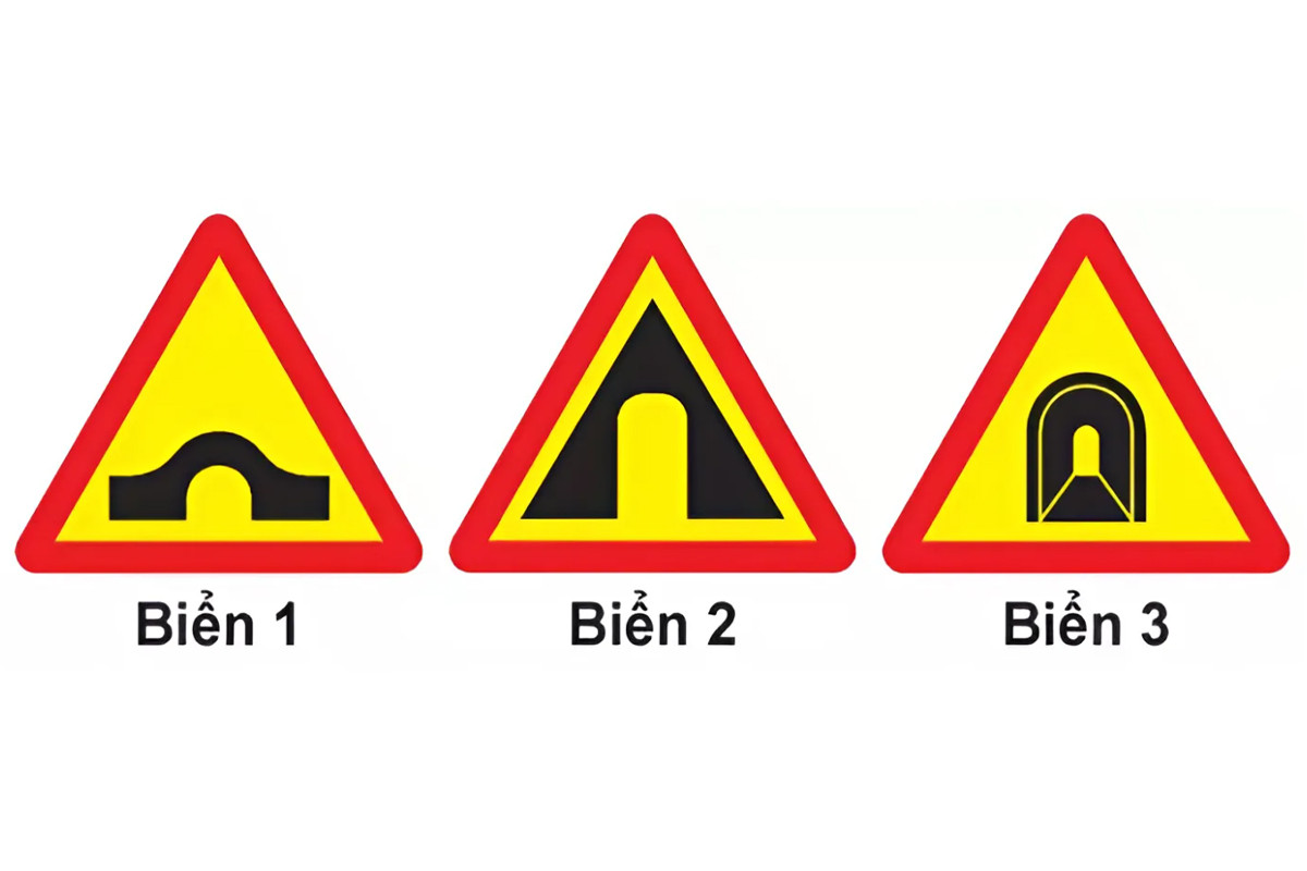 Đặc điểm nhận diện: Hình tam giác đều, viền đỏ, nền màu vàng, trên có hình vòm màu đen mô tả sự việc cần báo hiệu.