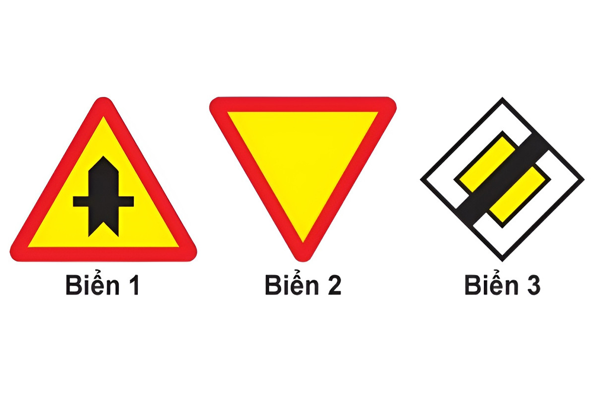 Đặc điểm nhận diện: hình thoi, nền trắng, viền đen; bên trong có hình thoi màu vàng viền đen, có gạch chéo đen. - D