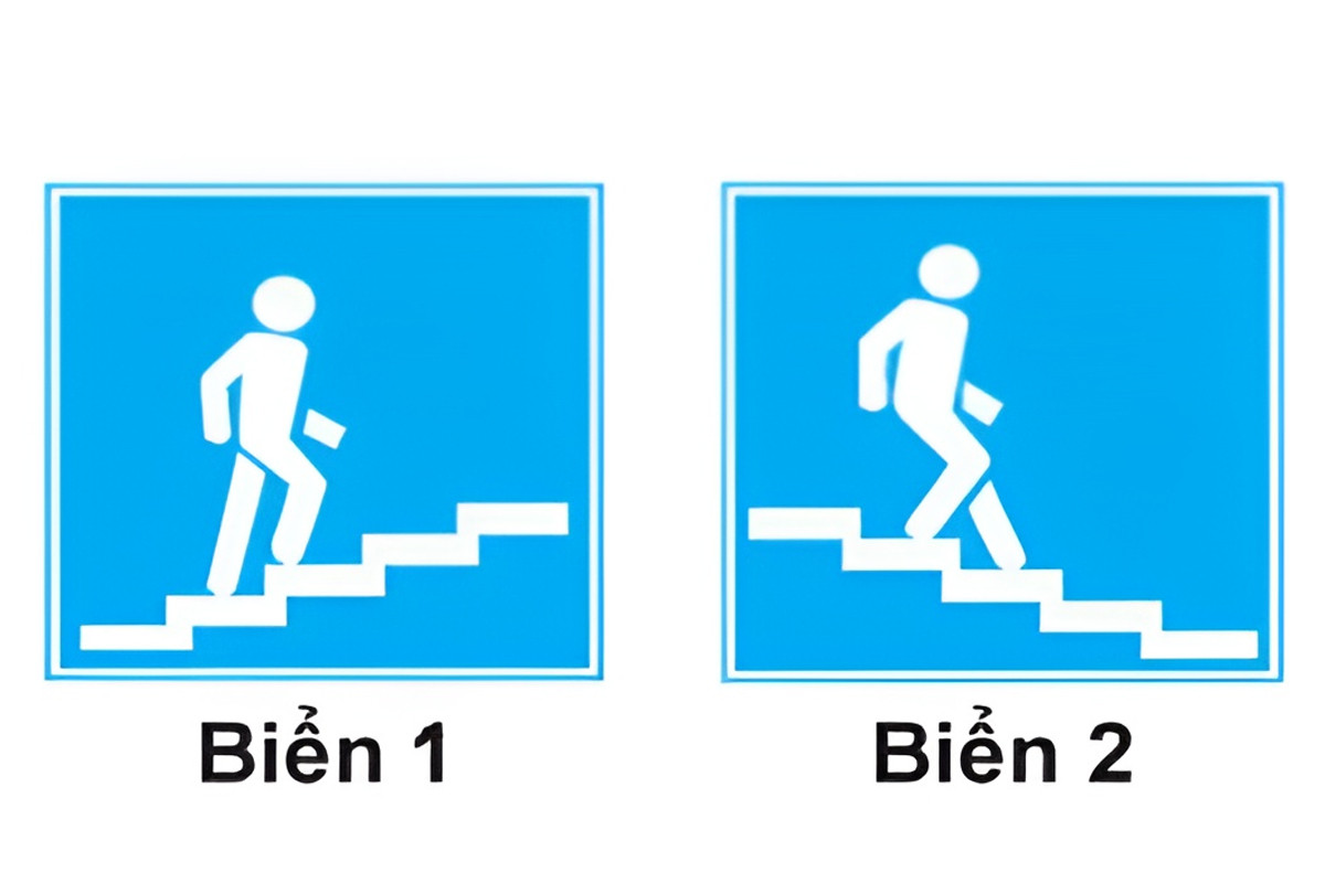 Đặc điểm nhận diện: có dạng hình vuông, nền màu xanh với hình vẽ người đi lên bậc thang ở giữa biển báo. - B