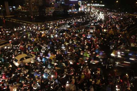 Hai hướng của Xa lộ Hà Nội đông nghẹt, đoàn người kéo dài gần 1 km. Nhiều xe máy di chuyển trên hướng này bất chấp nguy hiểm chạy lên cầu vượt hoặc len lỏi qua các kẽ hở của xe tải để tìm đường thoát khỏi đám kẹt xe.