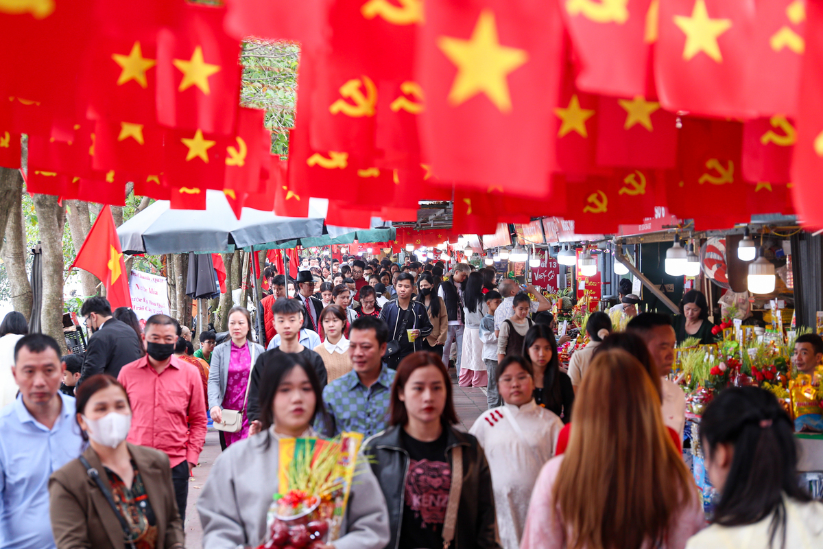 Do lượng người đổ về phủ Tây Hồ đông, nhiều em nhỏ phải ngồi trên vai bố để tránh bị lạc giữa dòng người