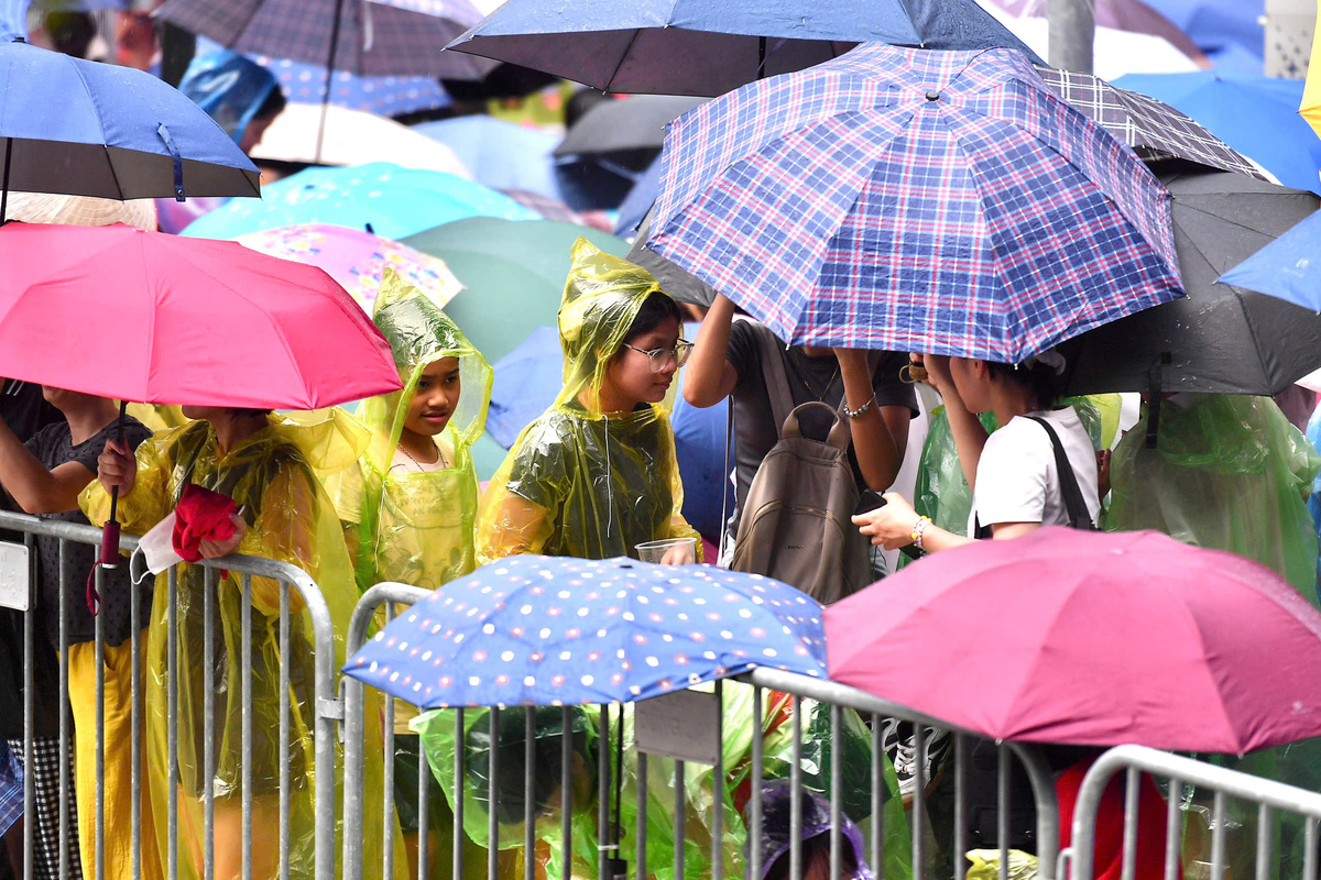 Đầu giờ chiều 24/8, Hà Nội mưa rào rải rác, người dân mặc áo mưa, che ô, xếp hàng giữ chỗ.