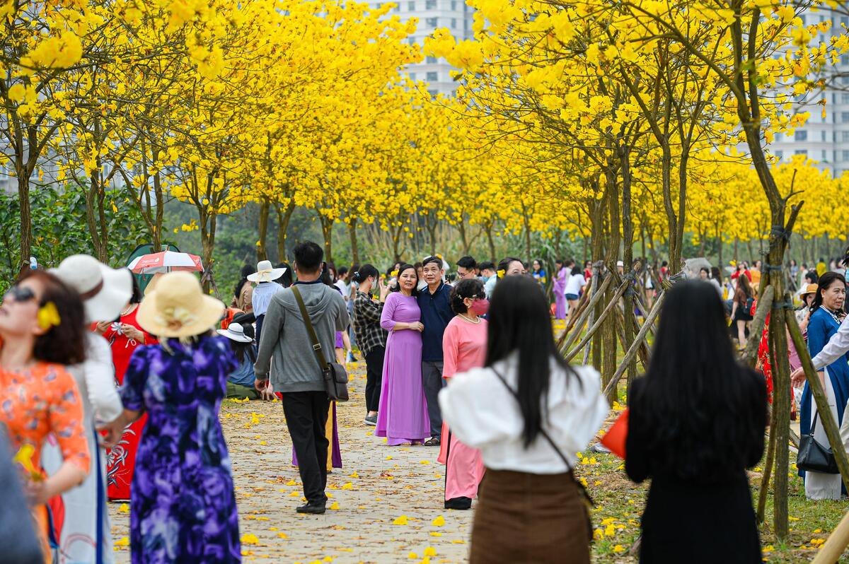 Ngày 18/3, cả nghìn người đổ xô đến con đường hoa phong linh vàng rực tại khu đô thị ParkCity Hà Nội (quận Hà Đông, Hà Nội) để tham quan, chụp ảnh.