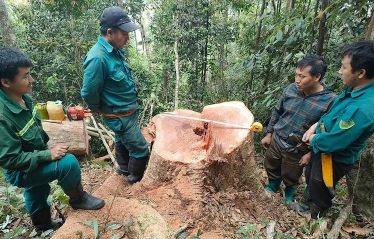 Tại hiện trường, những kẻ này vừa cưa hạ một cây gỗ có chiều dài thân 18,2m, vanh (chu vi vòng thân) đoạn gốc 243cm, vanh đoạn giữa 210cm, vanh áp ngọn 170cm; hai đoạn ngọn mỗi đoạn dài 7m.