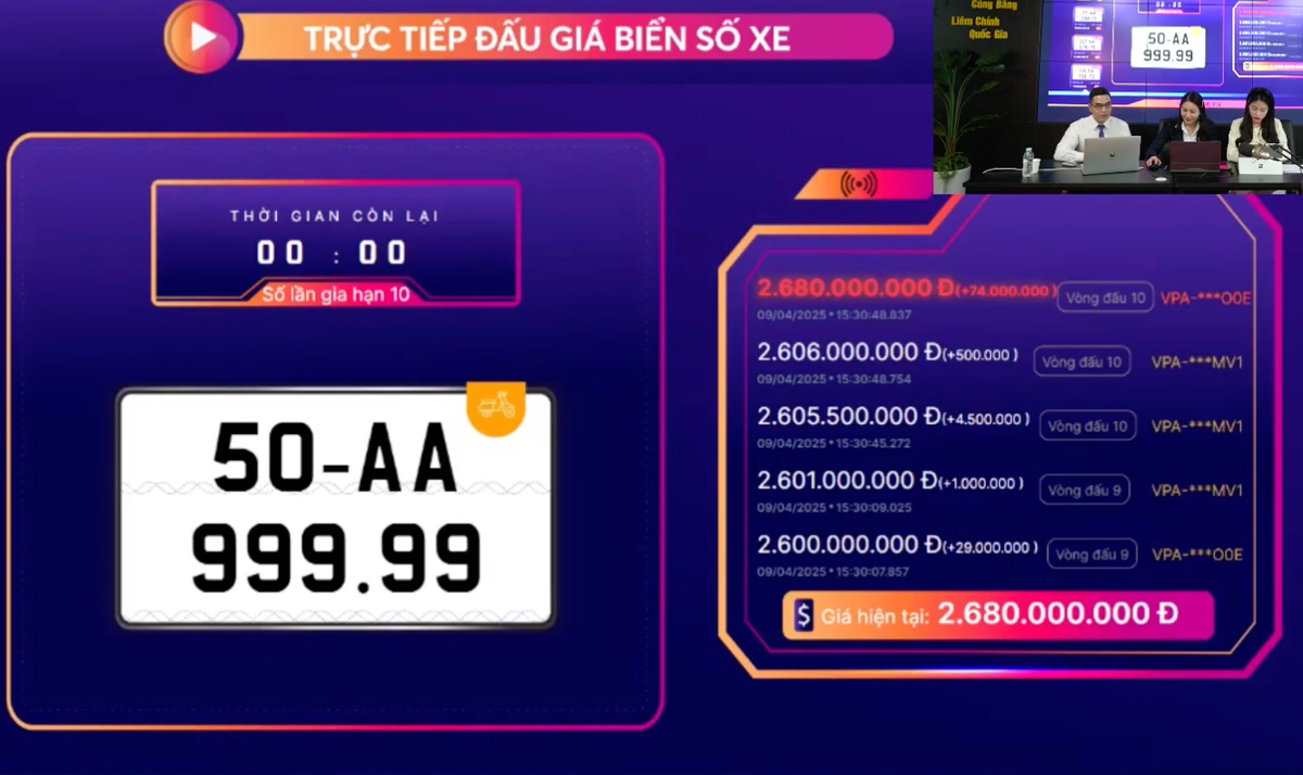 Đáng chú ý, biển số của TP.HCM 50AA-999.99 trúng đấu giá cao nhất với 2,68 tỷ đồng. Ngay từ khi "lên sàn", biển số này đã được trả giá đến gần 700 triệu đồng. Phiên đấu giá kịch tính ở những phút cuối khi liên tục được trả giá tăng lên, có những bước trả giá lên đến gần 100 triệu đồng.