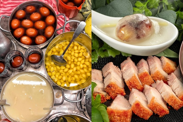 Thực chất món bao gồm những viên bột lọc có bọc nhân heo quay bên trong. Thay vì ăn với nước mắm chua ngọt như thường thấy thì chúng lại sóng sánh trong nước đường ngọt nhẹ. Sự kết hợp mặn ngọt cứ tưởng chẳng hề liên quan nhưng đã tạo nên một hương vị độc đáo, mới lạ. Những viên bột lọc dai dai hòa quyện cùng nhân thịt, nấm mèo đậm đà, nhai rất lạ miệng. Nước chè thoang thoảng mùi thơm của lá nếp làm người ta quên đi cái nghi ngại trước đó.