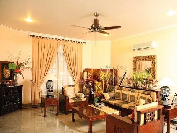 Đây là căn nhà anh chị xây dựng khi mới từ hải ngoại về Việt Nam cách đây vài năm. Phòng khách của biệt thự được trang hoàng sang trọng, lộng lẫy với gam màu chủ đạo là vàng.