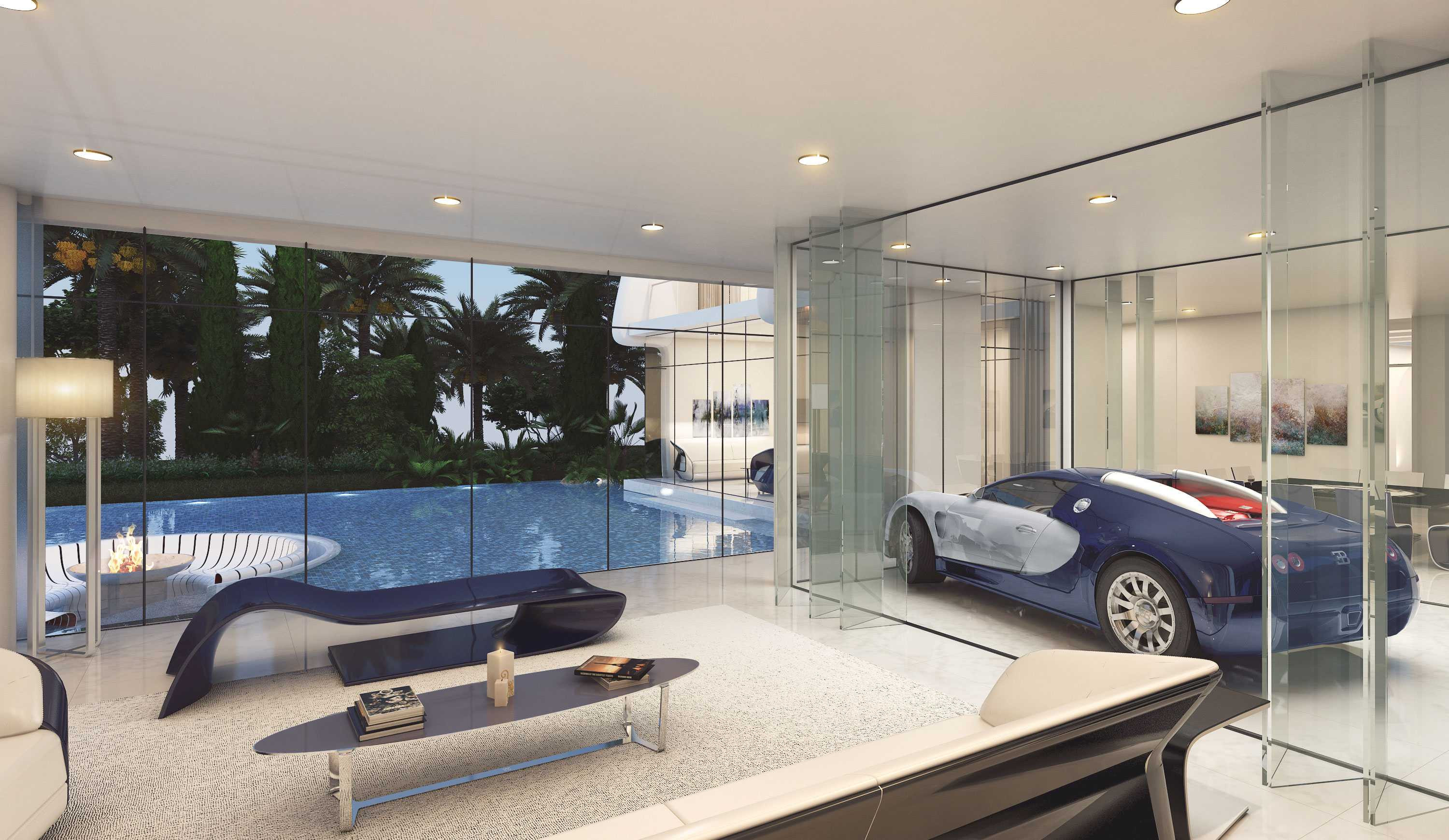 | Biệt thự nào cũng có phòng khách trưng bày xe Bugatti gắn với bể bơi ngăn bằng vách kính trong suốt |